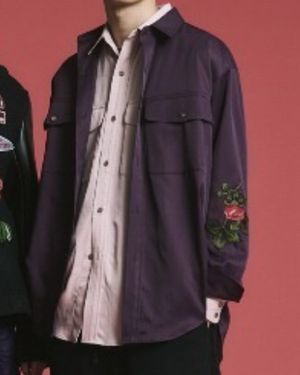 ドラマ「ちょっとだけエスパー」のポスタービジュアルで、ディーンフジオカさんが着ているパープルのシャツ。お袖のローズワッペンがポイント!