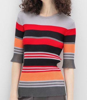 フレア袖配色プルオーバーリブニット
